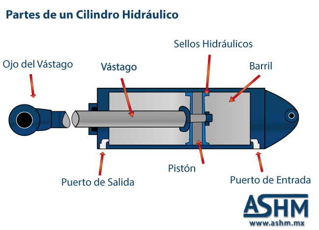 Los cilindros hidráulicos obtienen la energía de un fluido hidráulico presurizado, que es típicamente algún tipo de aceite. El cilindro hidráulico consiste básicamente en dos piezas: un cilindro barril y un pistón o émbolo móvil conectado a un vástago. El cilindro barril está cerrado por los dos extremos, en uno está el fondo y en el otro, la cabeza por donde se introduce el pistón, que tiene una perforación por donde sale el vástago. El pistón divide el interior del cilindro en dos cámaras: la cámara inferior y la cámara del vástago. La presión hidráulica actúa en el pistón para producir el movimiento lineal.